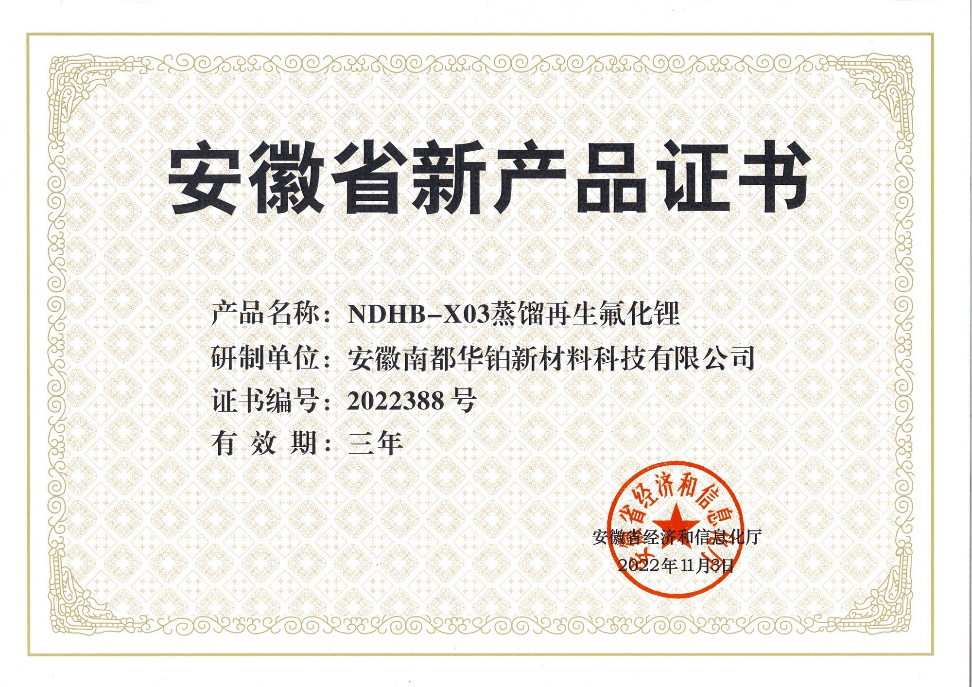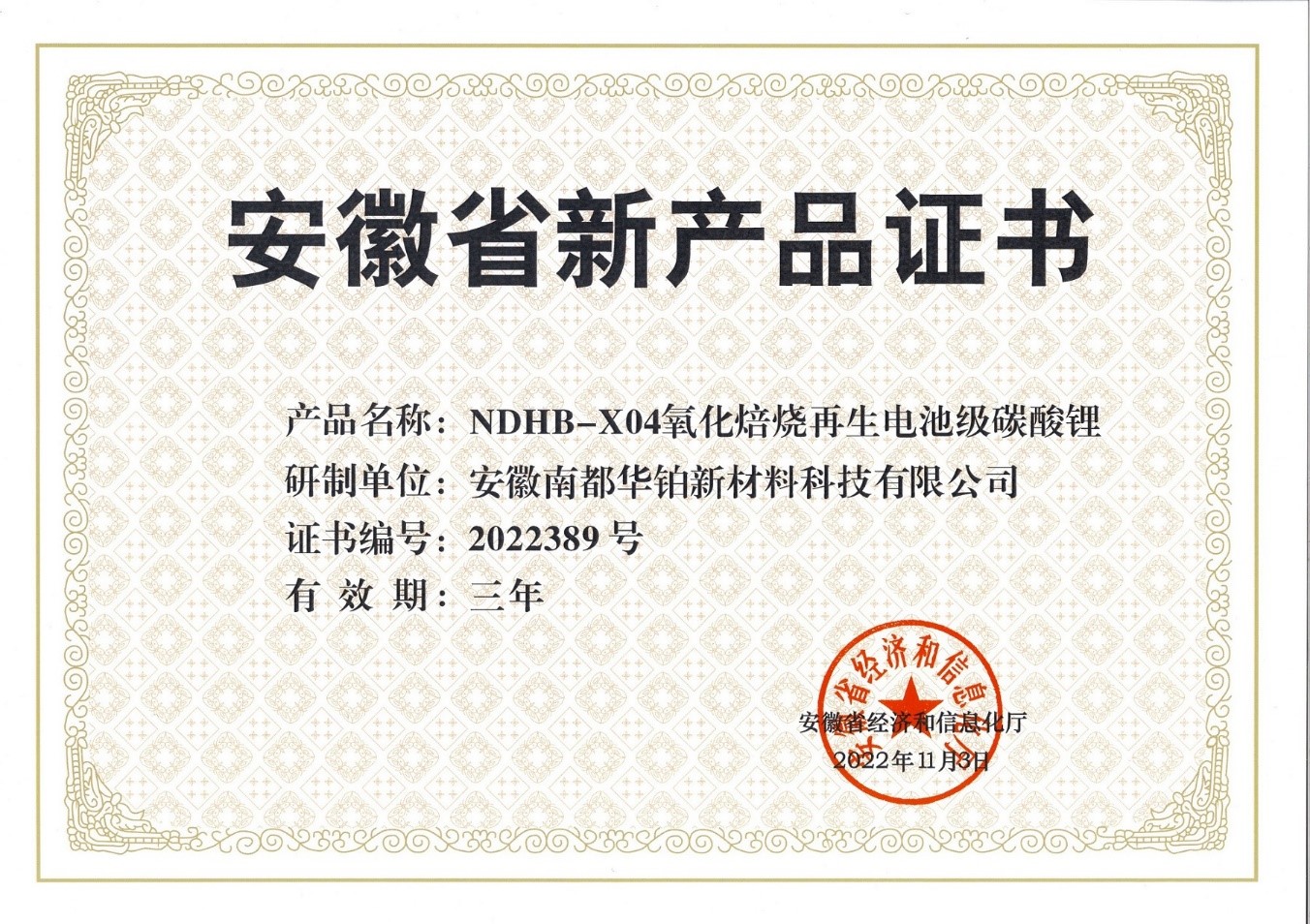 ÈÕǰ£¬°²»Õ×ðÁúʱ¿¹ÙÍø×¢²á»ª²¬ÐÂÖÊÁϿƼ¼ÓÐÏÞ¹«Ë¾Ñз¢µÄ¡°NDHB-X04Ñõ»¯±ºÉÕÔÙÉúµç³Ø¼¶Ì¼Ëáﮡ±ºÍ¡°NDHB-X03ÕôÁóÔÙÉú·ú»¯¼Ø¡±Á½Ïî²úÆ·£¬ÈÙ»ñ°²»ÕÊ¡¾¼ÃºÍÐÅÏ¢»¯ÌüÈ϶¨½ÒÏþµÄ2022Äê¶ÈµÚÈýÅú¡°°²»ÕʡвúÆ·Ö¤Ê顱¡£